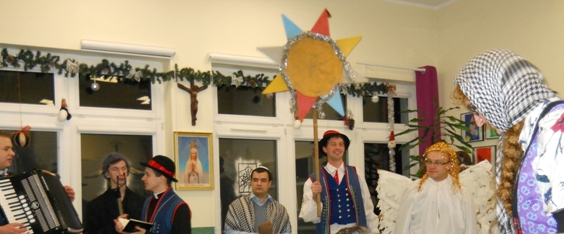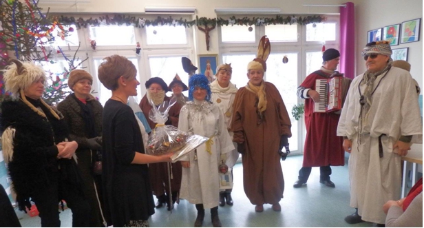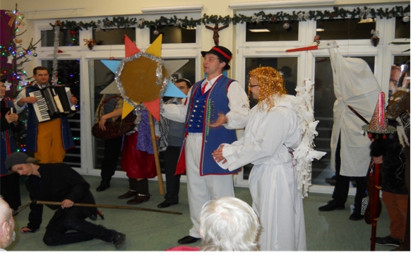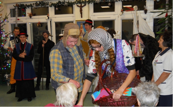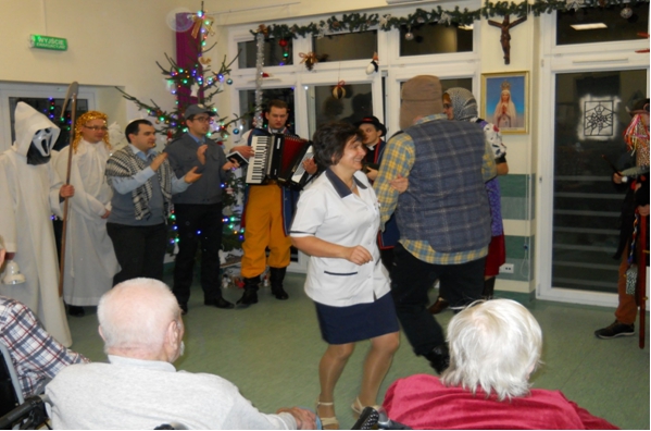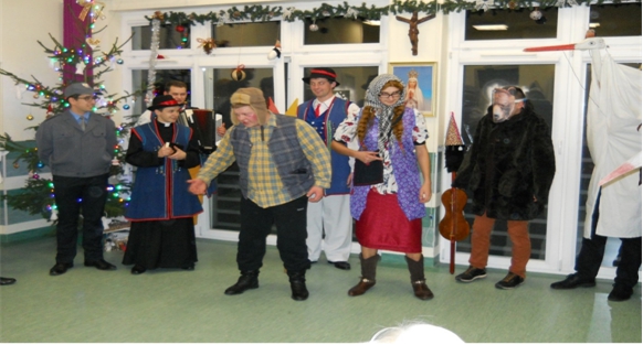 Zgodnie z prastar± tradycj± w naszym Szpitalu nie zabrak³o kolêdników, którzy przypomnieli o piêknym zwyczaju naszych pradziadków. Klerycy z Wy¿szego Seminarium Duchownego w Pelplinie przybyli do nas w roli Kaszubskich Kolêdników. Regionalna nazwa wigilijnego wêdrowania to „Gwi¿d¿e”. W¶ród postaci charakteryzuj±cych Kolêdników Kaszubskich mogli¶my zobaczyæ: Gwiozdka z dzwonkiem, Szndara (policjanta), kominiarza, diab³a „Purtka” z wid³ami, ¶mieræ z kos±, boæka, ksiêdza, popa, gwiazdê, „Babê i Dziada (Strech), zwierzêta (koza, baranek), anio³y. Arty¶ci swoj± ¿ywio³o¶ci±, regionaln± mow±, ¶piewem, muzyk± i wielobarwnymi strojami wprowadzili wszystkich w zachwyt. Najbardziej komiczn± postaci± okaza³ siê diabe³ek „Purtk”, który dokucza³ wszystkim, przeszkadza³, straszy³ i przegania³ wid³ami. Niejedna osobê zagoni³ w róg… Kolêdnicy w repertuarze wykonali wiersze, piosenki i przedstawienie o nadchodz±cym Narodzeniu Dzieci±tka Jezus. Pacjenci podziêkowali gromkimi brawami i ¿yczeniami.      W ¦wiêto Trzech Króli przybyli kolêdnicy z Tczewskiego Towarzystwa Kulturalnego „Brama”. Bardzo rado¶nie przywitali licznie zebranych pacjentów i go¶ci w szpitalnej ¶wietlicy. W¶ród kolêdników podziwiaæ mogli¶my oddanych pastuszków graj±cych na instrumentach, anio³y, zwierzêta (koza, koñ, kotek), psotnego diabe³ka, gwiazdeczki, gwiezdnika, królów (zgodnie ze ¦wiêtem Objawienia Pañskiego), ale przede wszystkim Rodzinê ¦w. – Maryjê z Dzieci±tkiem i Józefa. Arty¶ci bardzo weseli, kolorowi i roz¶piewani przypomnieli o cudzie Narodzin Jezusa, tradycyjne kolêdy i pastora³ki. Niekoñcz±ce siê brawa pacjentów zachêci³y kolêdników do podtrzymywania tej piêknej tradycji, spotkamy siê za rok. Jase³ka