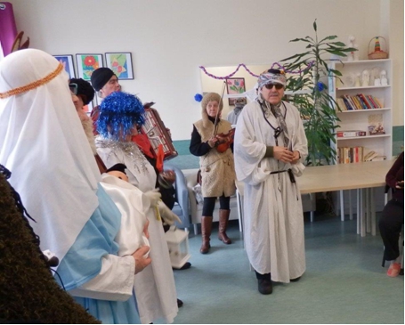 Historiê Bo¿ego Narodzenia w piêknej scenerii przedstawi³y nam dzieci ze ¶wietlicy ¦rodowiskowej w Tczewie przy ul. Kopernika, pod kierownictwem P. Aleksandry Lis. Pojawili siê anio³owie, pastuszkowie, królowie, Maryja z Dzieci±tkiem i ¦w. Józef. Dzieci i ich Rodzice oraz Babcie w piêknych strojach, z radosnym u¶miechem, ¶piewem i ogromnym zaanga¿owaniem wcieli³y siê w role artystów. Efekt by³ fantastyczny. Pacjenci w podziêkowaniu z³o¿yli ¿yczenia ¶wi±teczne i s³owa wdziêczno¶ci dla P. Kierownik, opiekunów i Rodziców za tê magiczn± atmosferê ¦wi±t. Dzieci obdarowa³y pacjentów szopk± bo¿onarodzeniow±. Koncert Bo¿onarodzeniowy