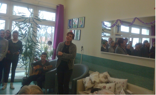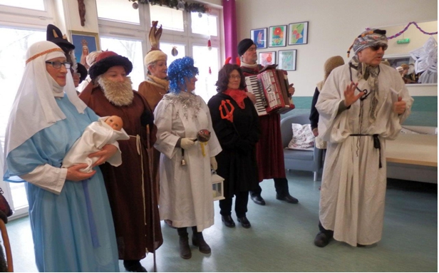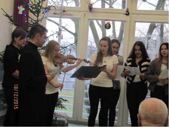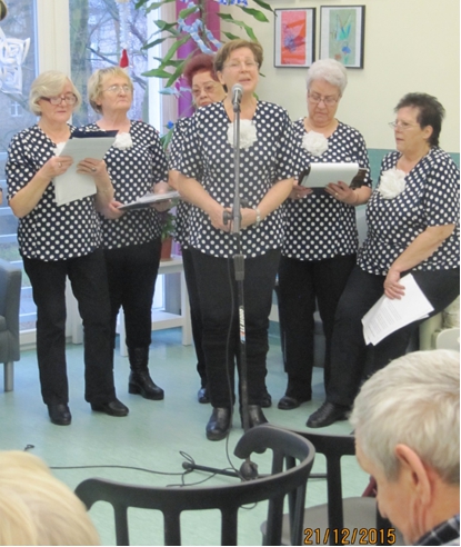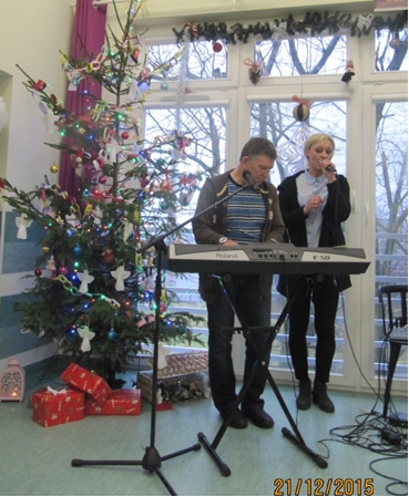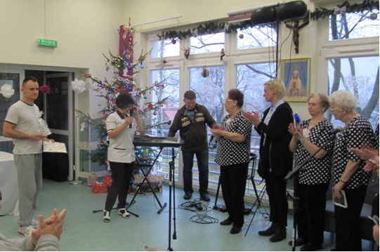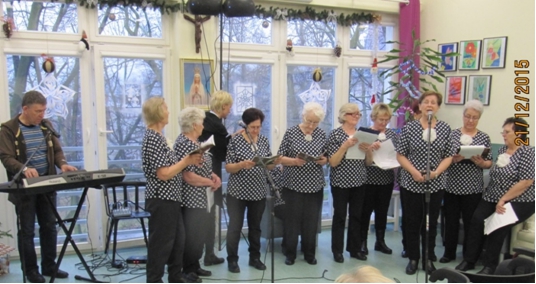 Trwaj±c w okresie ¦wi±t Bo¿ego Narodzenia, 21.12.2015r. go¶cili¶my z Koncertem Kolêd wiecznie m³odych wykonawców Zespo³u Fisolki-MOPS Tczew pod dyrekcj± P. Iwony Belka, akompaniament – P. Mariusz Dworakowski. Ró¿norodno¶æ utworów i aran¿acji wykonywanych kolêd i pastora³ek wprowadzi³a mi³± atmosferê. Uczestnicy przypominali sobie kolejne zwrotki utworów, tak wiêc po chwili s³ychaæ by³o chóralne, wspólne ¶piewanie, co stworzy³o wyj±tkow± atmosferê. Us³yszeli¶my kilka nowych utworów, m.in. „Kolêdê dla Nieobecnych”, któr± Pacjenci bardzo polubili. Nie zabrak³o ¶mia³ków, którzy podjêli próby wystêpu razem z Zespo³em lub solo. S³uchacze podziêkowali wykonawcom za koncert gromkimi brawami, ¿yczeniami i upominkiem w wykonaniu pacjentów. |